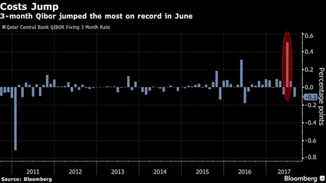 В июне в Катаре было зафиксировано максимальное почти за два года сокращение иностранных депозитов и рекордный скачок трехмесячной катарской межбанковской ставки предложения (Qatar Interbank Offer Rate, QIBOR).