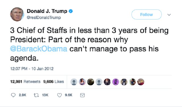 В этом твите от 2012 года Трамп критикует бывшего президента США Барака Обаму за то, что у него менее чем за 3 года президентского срока сменилось три главы администрации.