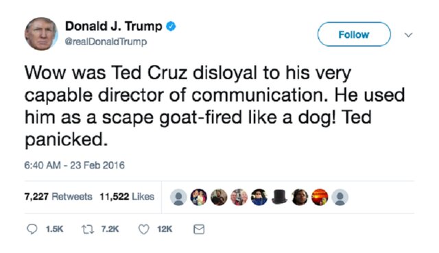 После того, как Трамп раскритиковал Круза за то, что тот уволил своего лучшего пресс-секретаря, "как собаку", Трамп сделал то же самое после того, как стал президентом.