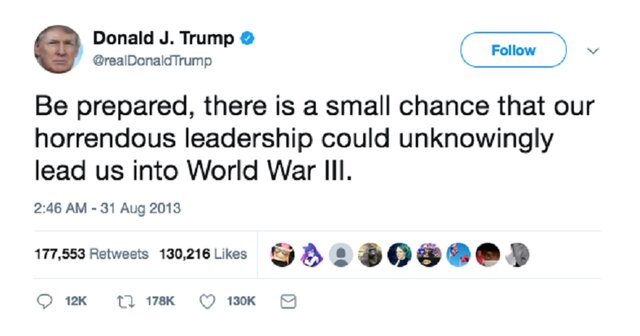 Трамп сделал такое предупреждение в 2013 году. Под "ужасным руководством" страны он подразумевал Обаму.