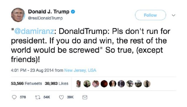 Как отмечают многие читатели Твиттера Трампа, практически на каждую ситуацию, актуальную сегодня, Трамп делал записи в своем Твиттере раньше.