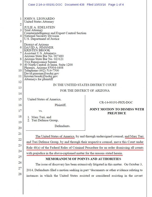 Вместо этого, адвокаты, представлявшие власти США в данном процессе, отозвали иск против Тури и его компании в понедельник, 3 октября.