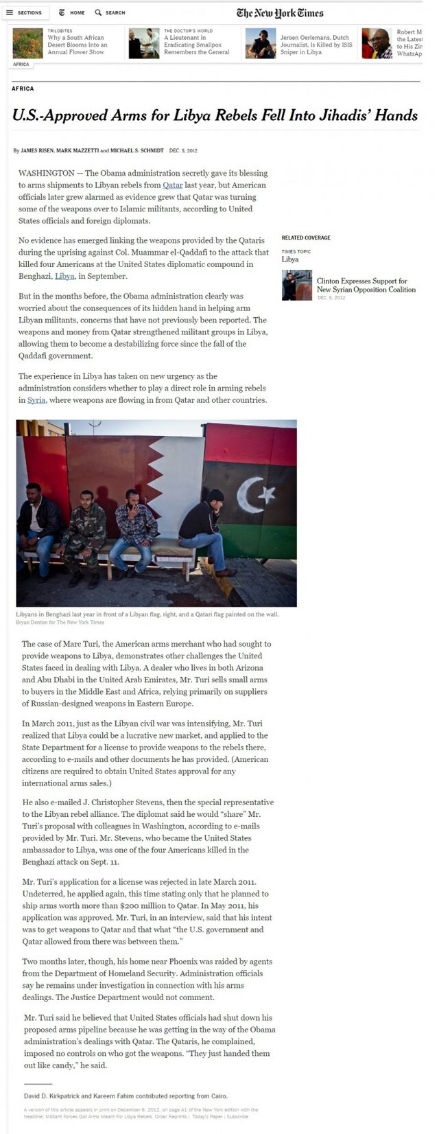"В прошлом году администрация Обамы втайне одобрила поставки оружия из Катара для ливийских повстанцев. Однако, по данным официальных представителей США и иностранных дипломатов, позднее американские чиновники были встревожены появлением доказательств того, что Катар переправлял часть оружия исламистским боевикам.