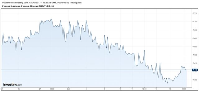Под определенным давлением находятся и российские облигации. Доходности пятилетних ОФЗ, пользовавшихся в последнее время наибольшим спросом, сегодня подрастают примерно на треть процента.