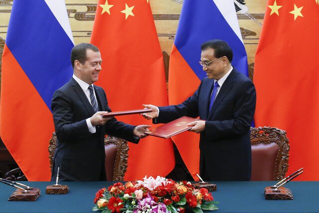 Премьер-министр РФ Дмитрий Медведев и премьер Госсовета КНР Ли Кэцян на встрече в Пекине. Фото: EPA-EFE/THOMAS PETER / POOL