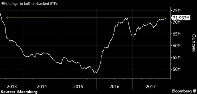 Активы биржевых фондов, ориентированных на золото, в пятницу увеличились до 71,9 млн унций, достигнув максимума с мая 2013 года, свидетельствуют данные, собранные Bloomberg. SPDR Gold Shares, - крупнейший ETF, ориентированный на золото, - привлек максимальный объем средств с сентября, поскольку расследование связей президента США Дональда Трампа и его ближнего круга с Россией активизировалось.