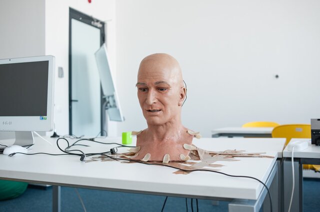 "Центр нашего проекта – мехатронная голова, это и есть сам проект – "Гагарин". Лицо неотличимо от человеческого, внутри головы – сложная система из 30 моторчиков, приводящих в движение мускулы лица андроида. Благодаря им робот открывает и закрывает глаза, наклоняет и поворачивает голову. В глаза "Гагарина" встроены две видеокамеры.