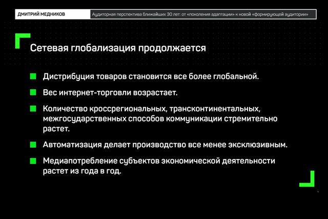 "Как бы парадоксально это не звучало, но сейчас все более и более важно не то, насколько ваш маркетинг подходит к вашему товару, если вы бизнесмен, и это касается и странового товара. Все более важным становится то, насколько то, что вы производите, подходит вашему маркетингу. По сути своей, медиа становятся кровеносной системой экономики не только локальной, но и глобальной. Все больше и больше глобальных медиа, тех самых способов коммуникации, о которых мы говорим, и надо четко для себя понимать, что есть два способа развития экономики - госплан и медиаплан".И хотя глобализация стирает границы в медиабизнесе, маркетинг нужно развивать не только на международном, но и на внутреннем рынке. Парадокс заключается в том, что контент, несмотря на глобализационнные процессы, становится все более персонализированным. И причина в смене аудитории.