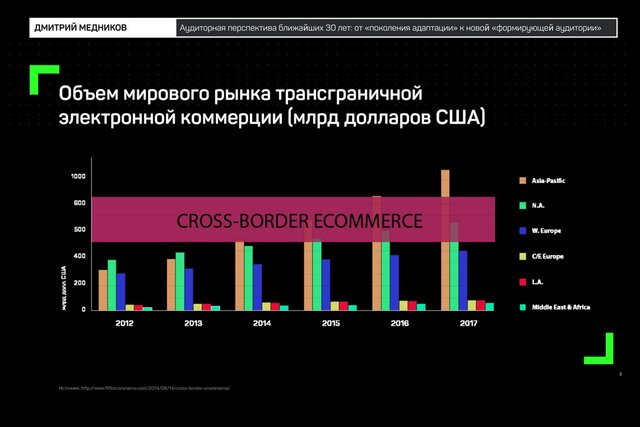 Очевидно, что электронная коммерция пользуется спросом, но эксклюзивности - все меньше, а конкуренция - все жестче. По мнению Дмитрия Медникова, время локальных игроков прошло. Еще немного, и будет лишь два варианта: "либо ты глобальный игрок, либо не игрок". И потребителю продавать локальный контент в отрыве от глобального контекста теперь сложно: у аудитории есть доступ к любым поставщикам медиапродукции, нужно поддерживать определенный уровень качества, не отставать от конкурентов, а международный маркетинг становится одним из ключевых звеньев экономики.