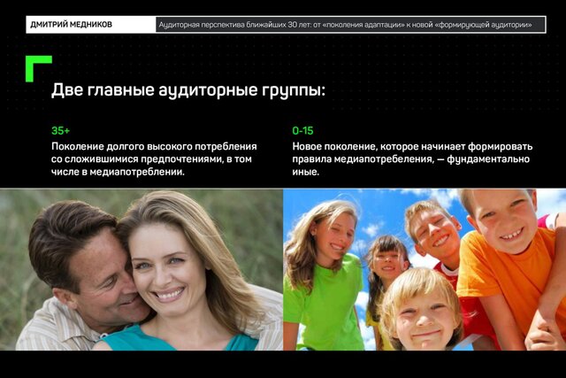 Дмитрий Медников считает, что для современных СМИ основными аудиторными группами являются: "35+" и "0-15". Первая из них обеспечивает основной спрос на товары и услуги сегодня, является основным драйвером экономики. Вторая будет формировать спрос в будущем.