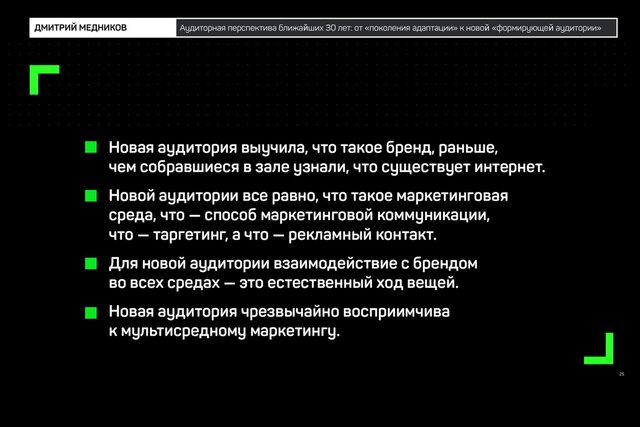 "Мы видим по кинематографу, насколько история движения вокруг бренда замещает традиционную киноиндустрию. Потому что, по сути, то, что мы с вами видим, это: все больше франшиз, все больше сиквелов и приквелов. Это же не совсем кинематограф. Это проникновение бренда во все среды. Это проникновение бренда в диджитал, в игрушки, а для монетизации бренда используется кинотеатр для того, чтобы посмотреть часть этого мира, к которому человек привыкает, будучи уже представителем поколения формирования экономического и коммуникационного. И ему удобно жить в мире привычных для него сюжетов и героев"."Формирующая аудитория" не готова к компромиссам. Усомнившись в качестве того или иного продукта или услуги, она уже не изменит свое мнение, даже если попытаться привести разумные аргументы. Придется приложить огромное количество усилий, чтобы переубедить ребенка, которому не понравился бренд, утверждает Медников. И даже если бренд сам по себе хорош, но не может присутствовать во всех средах одновременно, он может восприниматься как неполноценный и ущербный.
