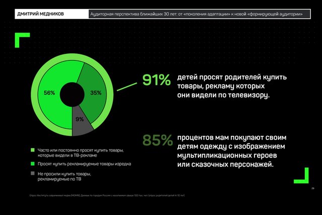 "Дети становятся проводником знаний и информации о том, что семья должна сегодня делать, что потреблять. И если от микрохозяйства перейти к макро, то они все больше ориентируют экономику и определяют, куда ей двигаться. Будь то финансы или медиапотребление или еще какой-то тип экономической жизни, дети уже сейчас, исподволь, начинают на это влиять, а через несколько лет их влияние увеличится кратно".Новое поколение станет самым медийным за всю историю человечества. И медиабизнесу необходимо уметь с ним договариваться. Только так можно сохранить бренды и определиться с направлением развития не только сферы медиа, но и цивилизации как таковой.