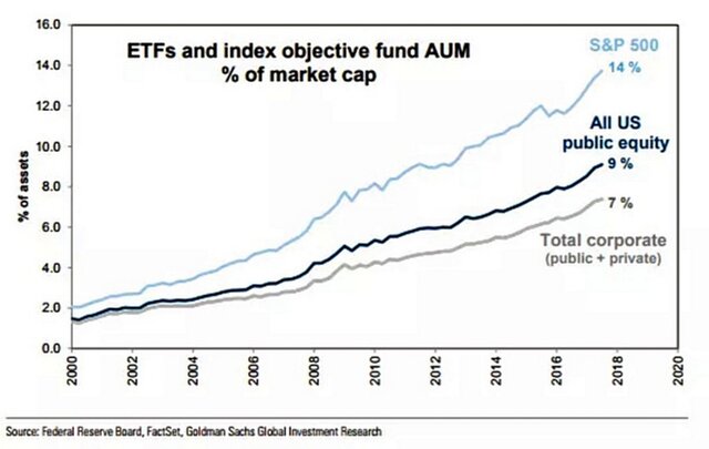 По оценкам Goldman, в настоящее время ETF и инвестфонды, отслеживающие индексы, контролируют около 6% всего фондового рынка США по сравнению с 3% в 2009 г. При этом они контролируют 14% акций компаний, входящих в индекс S&P 500.