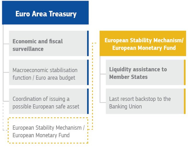 "Экономическое и фискальное наблюдение за ситуацией в еврозоне и ее отдельных членах может быть поручено Министерству финансов еврозоны. Министерство финансов могло бы объединить существующие полномочия и услуги, которые сегодня рассредоточены по различным институтам и учреждениям. Его мог бы возглавить один из министров финансов стран еврозоны, который также будет председательствовать в Еврогруппе.