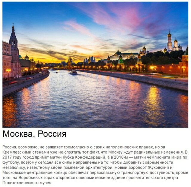 Составители рейтинга отметили, что в Москве вскоре пройдут крупные спортивные соревнования (столица РФ примет матчи Кубка Конфедераций в 2017 г., в 2018 г. – матчи чемпионата мира по футболу).