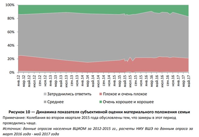 О позитивной оценке собственного материального состояния говорят и другие опросы. Так, например, согласно данным ВЦИОМ 17% россиян оценивают экономическую ситуацию в стране выше среднего, 25% - ниже, 55% - средне.