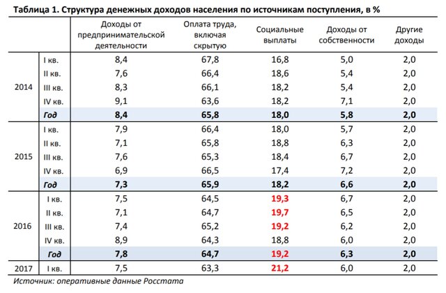При этом заметно выросла доля социальных доходов в структуре поступлений граждан. Если в начале 2014 г. она была меньше 17%, то сейчас показатель достигает 21,2%.