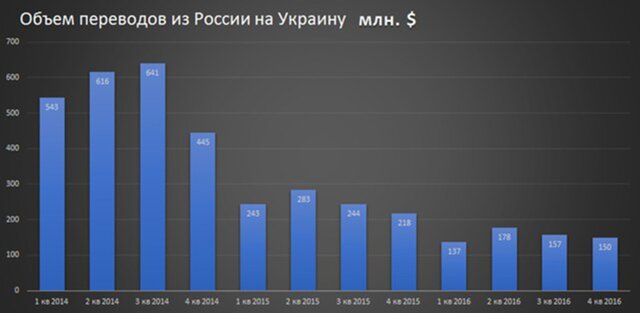 До 2015 г. укранские мигранты лидировали по переводам из России - до $3 ежегодно. В этом году лидерство переходит к Киргизии - по итогам года, по предварительнойй оценке, киргизские мигранты могут перевести из РФ до $2,8 млрд, что на 25% больше, чем годом ранее. В апереле 2017 г. Россия ограничила денежные переводы на Украину.