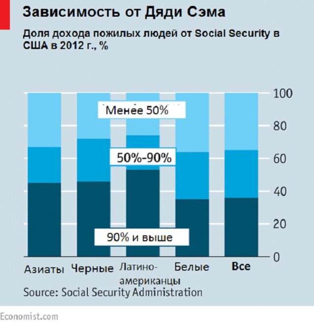 Всё это делает людей очень зависимыми от государства. В настоящее время примерно 60 млн американцев получают пенсию (средний размер которой $16 тыс. в год) из системы социального обеспечения (Social Security). Человек со средним доходом, при выходе на пенсию в 65 лет, может ожидать пенсию в размере 40% от своей последней зарплаты.