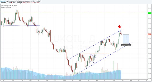 Потенциал падения, как мы видим, составляет примерно 8%, но до встречи в Дохе остается всего две торговые сессии. То есть, если представить, что цены будут падать до понедельника, то падение это будет обвальным. По состоянию на 9:20 по московскому времени снижение составляет 0,7%.