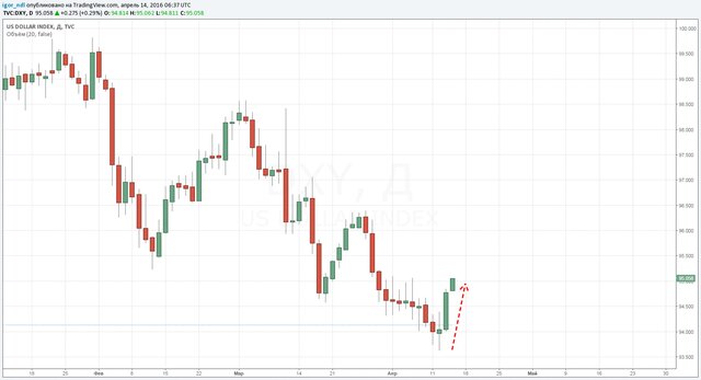 Возвращаясь к теме нефти, отметим, что ее коррекцию может спровоцировать рост курса доллара, тем более вчера как раз началось достаточно мощное укрепление американской валюты.