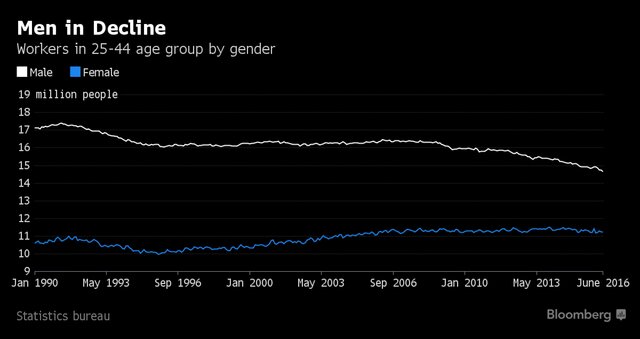 По данным официальной статистики, даже на фоне общего увеличения рабочей силы, в июне число работающих мужчин в возрастной группе 25-44 составило 14,7 млн человек, это самый низкий уровень за 48 лет.