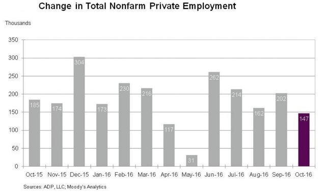 Количество рабочих мест в частном секторе США в октябре 2016 г. увеличилось на 147 тыс., свидетельствуют данные аналитической компании Automatic Data Processing (ADP). Это наименьший рост с мая и один из худших показателей за прошлый год, сообщает CNBC.Опрошенные Reuters аналитики в среднем ожидали, что компании частного сектора создали 165 тыс. рабочих мест в октябре.