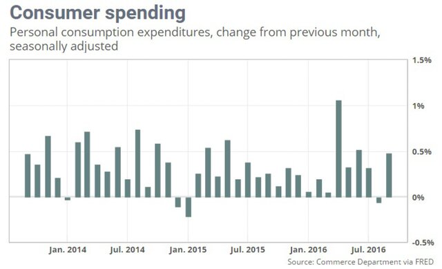 Потребительские расходы в США в сентябре выросли больше, чем ожидалось, так как домашние хозяйства увеличили покупки автомобилей, и инфляция устойчиво росла, что может усилить ожидания повышения процентной ставки на заседании ФРС в декабре.Расходы населения США в сентябре увеличились на 0,5% по сравнению с предыдущим месяцем, свидетельствуют данные министерства торговли страны. В то же время доходы американцев выросли на 0,3%.