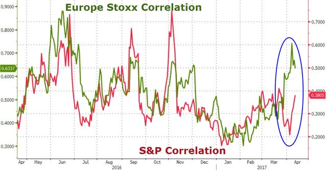 Корреляция американских и европейских фондовых рынков восстанавливается. Это часто происходит во время кризиса, и выражает обеспокоенность в связи с тем, что предстоящие политические события будут доминировать в рыночных движениях.
