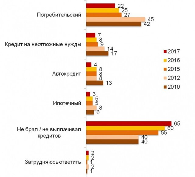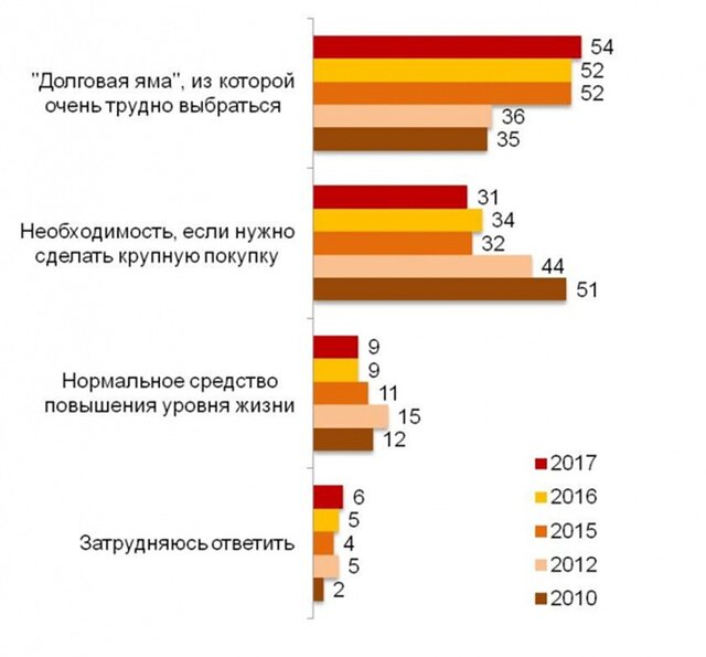 Как отмечается, аналогичные опросы проводились в 2010, 2012, 2015 и 2016 гг. По сравнению с 2010 г. доля тех, кто считает кредиты "долговой ямой" в 2017 г. увеличилась с 35% до 54%.