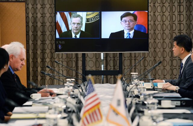 Торговый представитель США Роберт Лайтхайзер (слева на экране) и министр торговли Южной Кореи Ким Хён Чжон (справа) проводят переговоры в формате видеоконференции. EPA/YONHAP