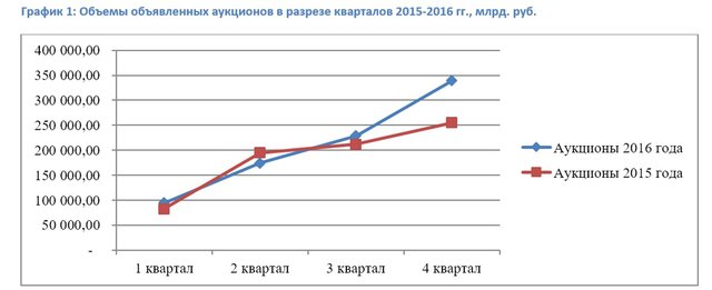 Так, объем аукционов, по итогам которых были заключены контракты (1 и более участников) в абсолютном выражении составил 837 342,32 млн. рублей, что превышает значение предыдущего года на 12%. При этом поквартальный анализ таких аукционов позволяет отметить наличие фактора сезонности на данном рынке: объемы аукционов, проведенных в каждом квартале 2016 года и аналогичных периодах 2015 года, демонстрируют схожую динамику, а именно – стабильный рост от начала года и достижение максимального значения в 4 квартале.