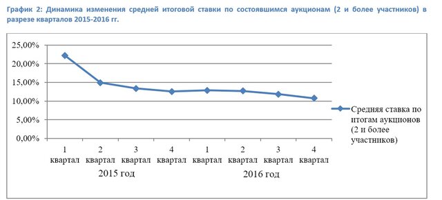 При этом анализ процентных ставок, сложившихся по итогам состоявшихся аукционов (2 и более участника) позволяет отметить обратную динамику – стабильное снижение от максимальных значений, достигнутых в начале 2015 года к сегодняшним рыночным показателям. Данная тенденция сохранилась и в 2017 году.