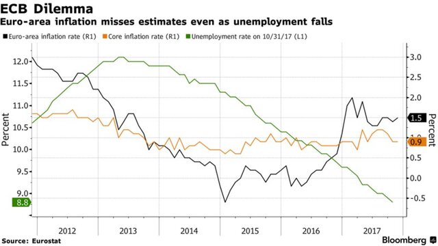 ЕЦБ стоит перед дилеммой: даже на фоне снижения безработицы и самого быстрого с 1997 г. роста экономики региона, восстановление потребительских цен остается подавленным.