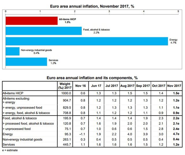 В ноябре европейская базовая инфляция (за исключением продовольствия, энергии и табака) осталась неизменной на уровне 0,9%, что, впрочем, также ниже 1% медианной оценки экономистов.