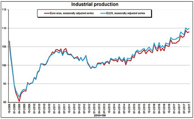 Москва, 13 декабря - "Вести.Экономика". Объем промышленного производства в еврозоне в октябре 2017 г. увеличился на 0,2% по сравнению с предыдущим месяцем, свидетельствуют данные Статистического управления Евросоюза (Eurostat).