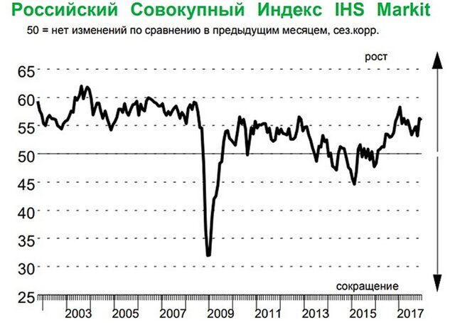 Показатель ниже 50 пунктов отражает снижение активности, выше - рост активности.