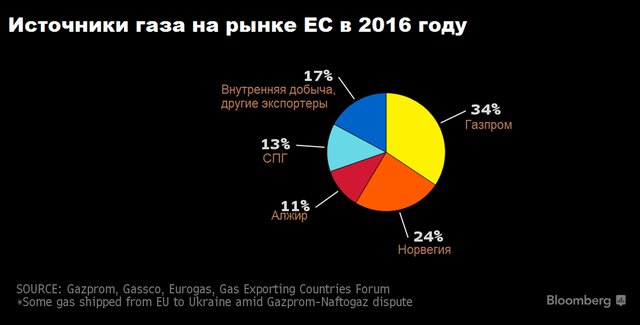 "Газпром", в прошлом году поставивший рекордное количество газа в ЕС, занимает 34% рынка Европы.