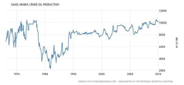 Как видно на графике, за исключение периода последнего перенасыщения рынка, Саудовская Аравия имела более или менее постоянный объем добычи нефти. Увеличение было незначительным, в среднем оно не превышало 1% в год.