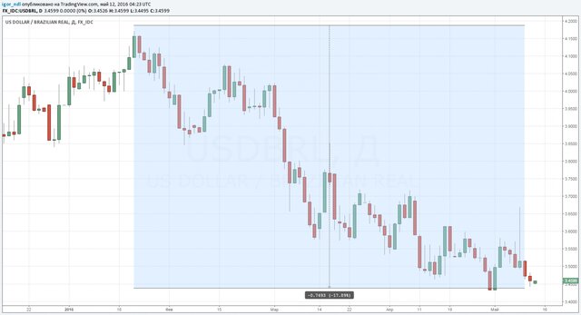 Схожая ситуация и на валютном рынке страны. Реал в последние месяцы демонстрирует укрепление, прибавив с февраля почти 20%. Впрочем, здесь ситуация скорее связана с общим изменением настроений на рынке и сильнейшим ростом стоимости нефти.