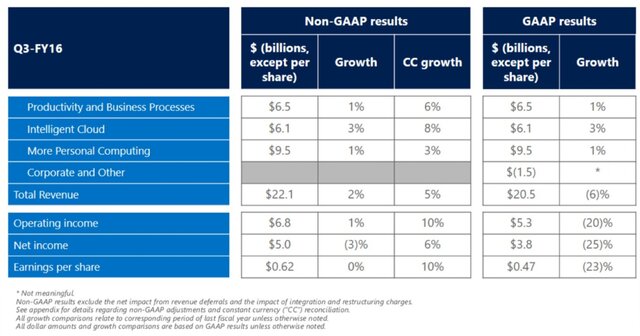 Корпорация Microsoft отчиталась о результатах третьего финквартала. Выручка не по системе GAAP составила составила $22.1 млрд., скорректированная прибыль в расчете на акцию - $0.62 и $0.47 за ценную бумагу в соответствии с общепринятыми принципами бухгалтерского учета (GAAP).