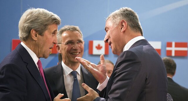 Госсекретарь США Джон Керри, генсек НАТО Йенс Столтенберг и премьер-министр Черногории Мило Джуканович после подписания протокола в штаб-квартире НАТО. Фото: Virginia Mayo / AP