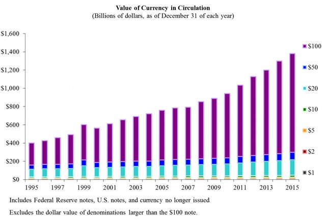 Именно поэтому Национальный банк Швейцарии обсуждает вопрос отказа от банкноты в 1000 франков, а ФРС прислушивается к бывшему главе Standard Chartered Питеру Сэндсу, который ранее заявил, что США должны запретить банкноты в $100.