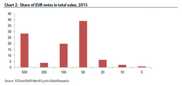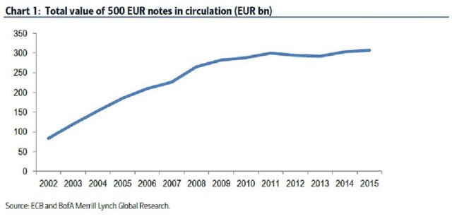 Общий объем банкнот в 500 евро в обращении составляет 306,8 млрд евро, и он растет, как свидетельствуют данные Bank of America Merrill Lynch.