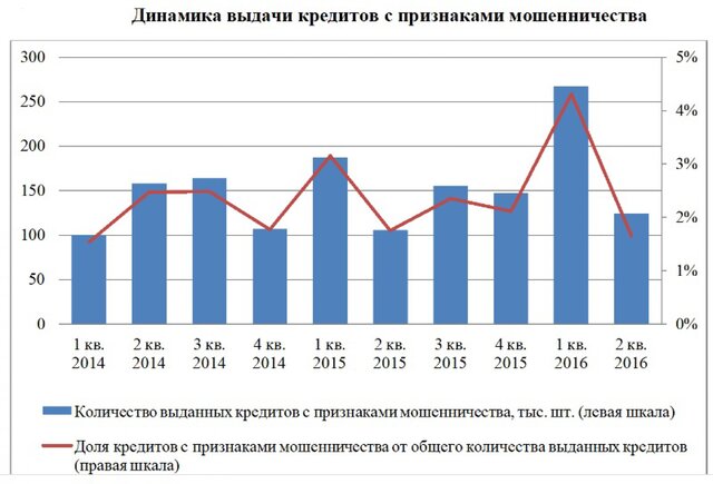 По сравнению с первым кварталом 2016 г., выдачи кредитов с признаками мошенничества сократилось на 53,5%.