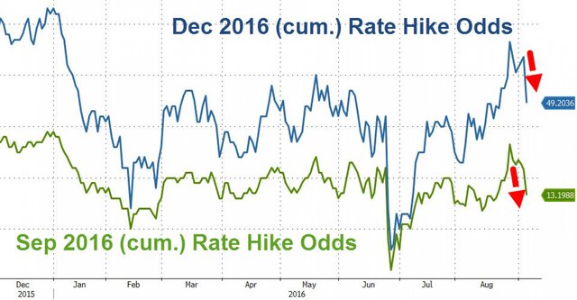 Разумеется, изменились ожидания относительно ближайших заседаний Федеральной резервной системы. Фьючерсы, отражающие вероятность повышения ставки в сентябре и декабре, резко пошли вниз.