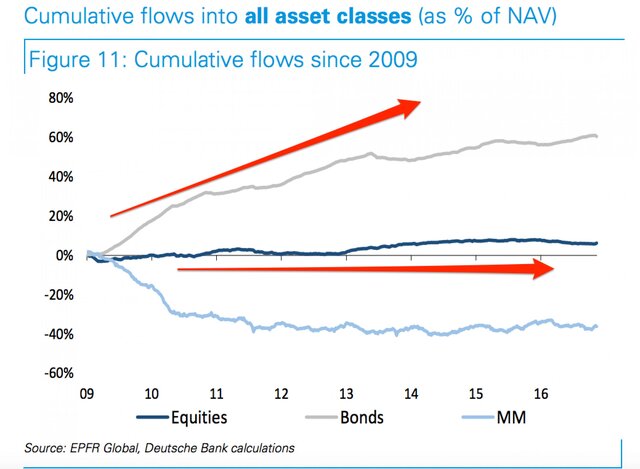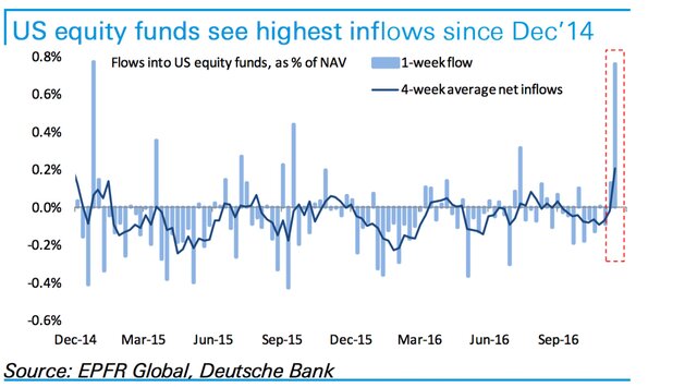 "Если такие стимулы в сочетании с пониженным регулированием бизнеса приведут к ускорению роста ВВП США (как ожидают наши американские экономисты), мы сможем наконец увидеть нормализацию потоков за счет того, что деньги будут переходить из фондов облигаций (приток - $1 трлн с 2009 г.) в акции развитых стран (приток - $400 млрд с 2009 г.)", - считают в Deutsche Bank.