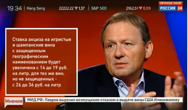 Шампанские вина и игристые вина станут дороже из-за повышения ставок акцизов, заявил Борис Титов, уполномоченный при президенте по защите прав предпринимателей в интервью в программе "Мнение".