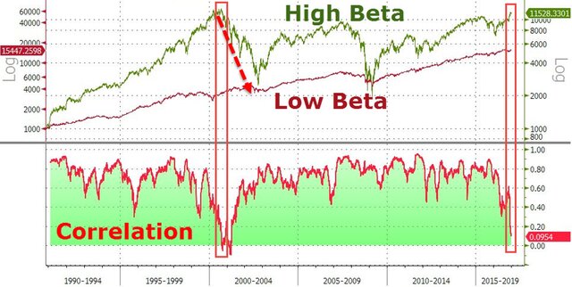 Еще более любопытный факт заключается в том, что корреляция акций из индекса S&P500 с высокой бетой и низкой бетой практически полностью исчезла, а ведь такое последний раз наблюдалось во время кризиса доткомов, после чего индекс Nasdaq рухнул.