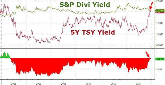 Ну и, конечно же, уже много раз говорилось о том, что дивидендная доходность индекса S&P 500 практически сравнялась с доходностью пятилетних трежерис, а это довольно редкий момент. На графике можно легко рассмотреть, когда последний раз возникала такая ситуация, и вспомнить, чем это закончилось.